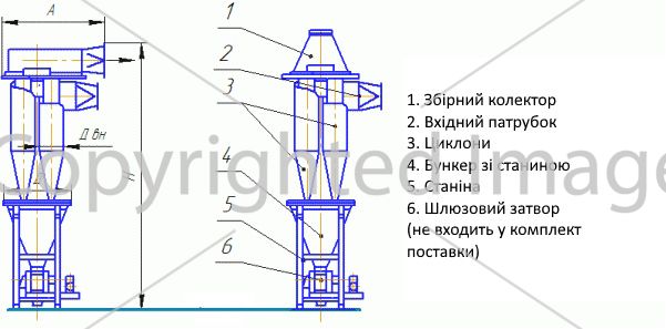 Циклон 4БЦШ призначений для очищення повітря від середньодисперсного зернового пилу. Пилоповітряна суміш надходить через вхідний патрубок, де пил осідає в накопичувальному бункері, а очищене повітря виходить через равлик.